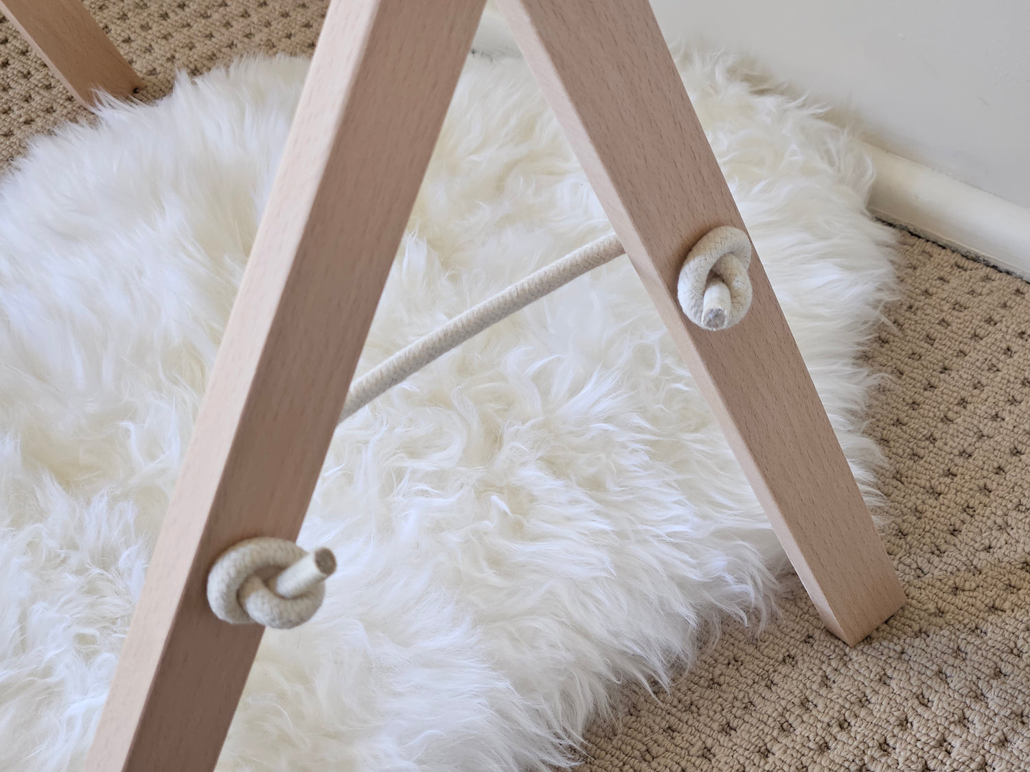 Baby gym frame is made of unfinished alder wood and sanded to be silky smooth.